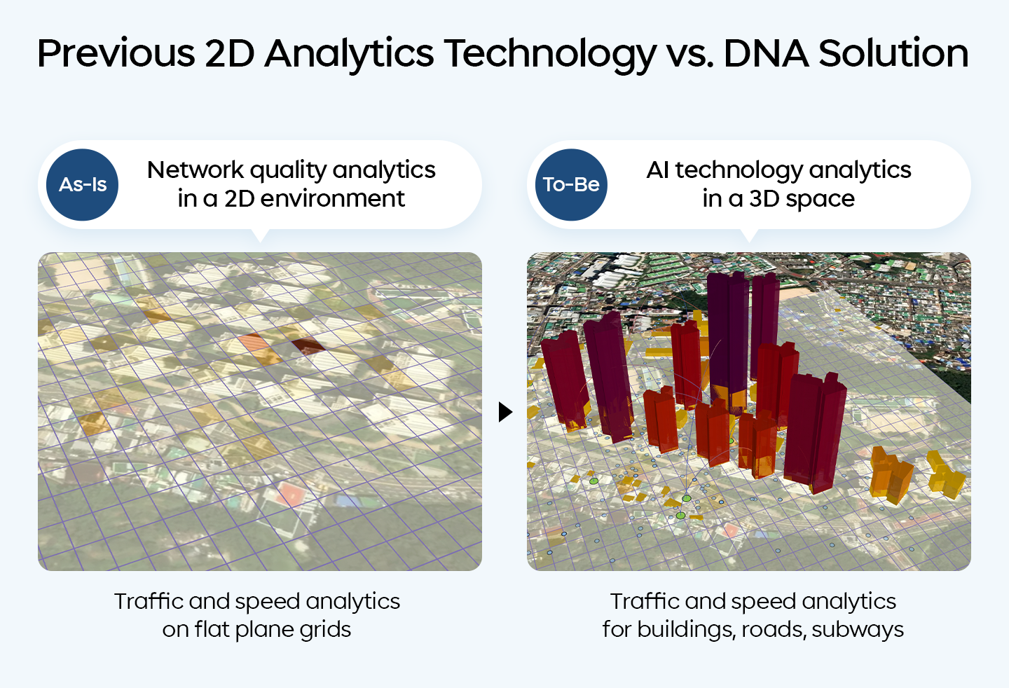 To address these limitations, SK Telecom developed the 'DNA (Deep Network AI)' technology, which analyzes and visualizes network situations in a 3D space by adding a map feature for buildings, roads, subways where customers usually stay or move around in.