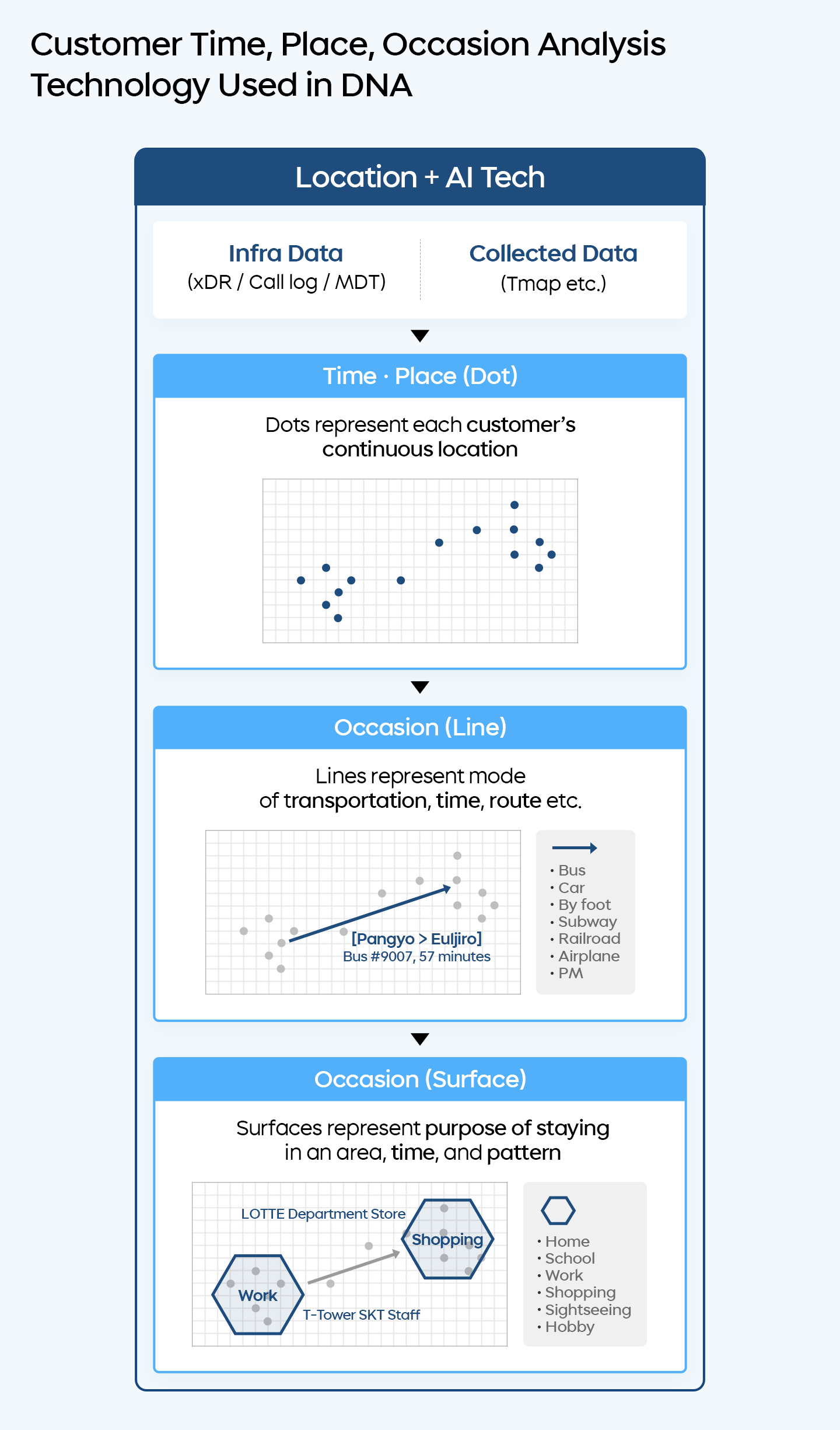 DNA utilizes AI-based network quality analysis technology, indoor positioning technology, and mobility analysis technology based on customers’ movement and stay data to accurately analyze their time, place, and occasion. The company predicts customer time and location by applying the collected data within the infrastructure to a transformer-based model, then the DBSCAN* model to classify movement and stay situations. They also map network data** according to the mode of transportation or purpose of staying in an area, allowing for precise analysis in each building environment or mobility scenario. This approach reduces the time required to resolve customer issues in the field and adjusts network quality, enhancing network operation efficiency as a result.