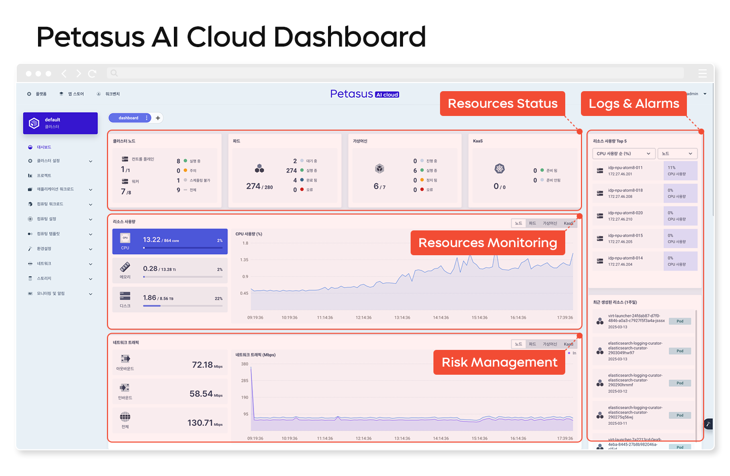 Petasus AI Cloud is a high-performance and high-efficiency cloud platform designed for building and operating AI Datacenters (AI DC). It applies virtualization technology optimized for AI operations to maximize the utilization of computing resources and reduce power consumption and operating costs. In particular, Petasus AI Cloud features an architecture tailored for AI operations, enabling telcos to run their AI DC more efficiently. This allows for more stable operation of AI services and applications. The name Petasus represents both the winged hat of the god Hermes in Greek mythology and the storage capacity unit of Peta bytes (1 quadrillion bytes).