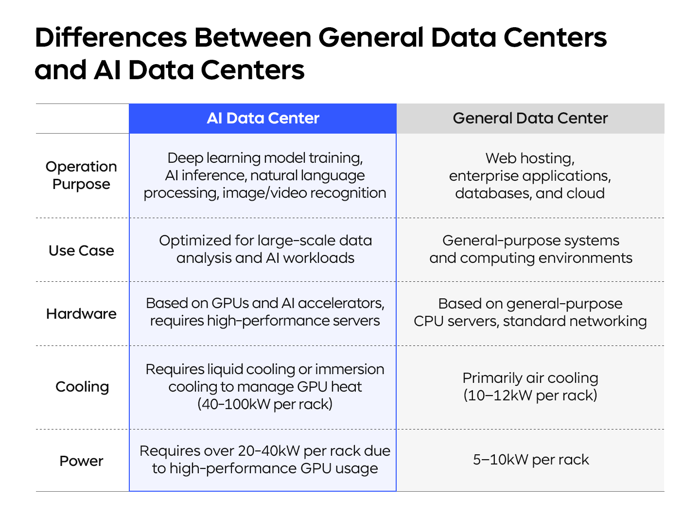 AI data centers stand out from traditional data centers in several key ways. Unlike general-purpose data centers, which are designed for a wide range of computing environments, AI data centers are specifically built for high-performance AI workloads. This requires GPU-centric hardware, advanced cooling solutions such as water or immersion cooling, and significantly higher power capacity. While general data centers primarily use air cooling, AI data centers rely on water or immersion cooling to manage the intense heat generated by GPU and AI accelerator-based servers - requiring cooling capacities of up to 40–100kW cooling per rack.