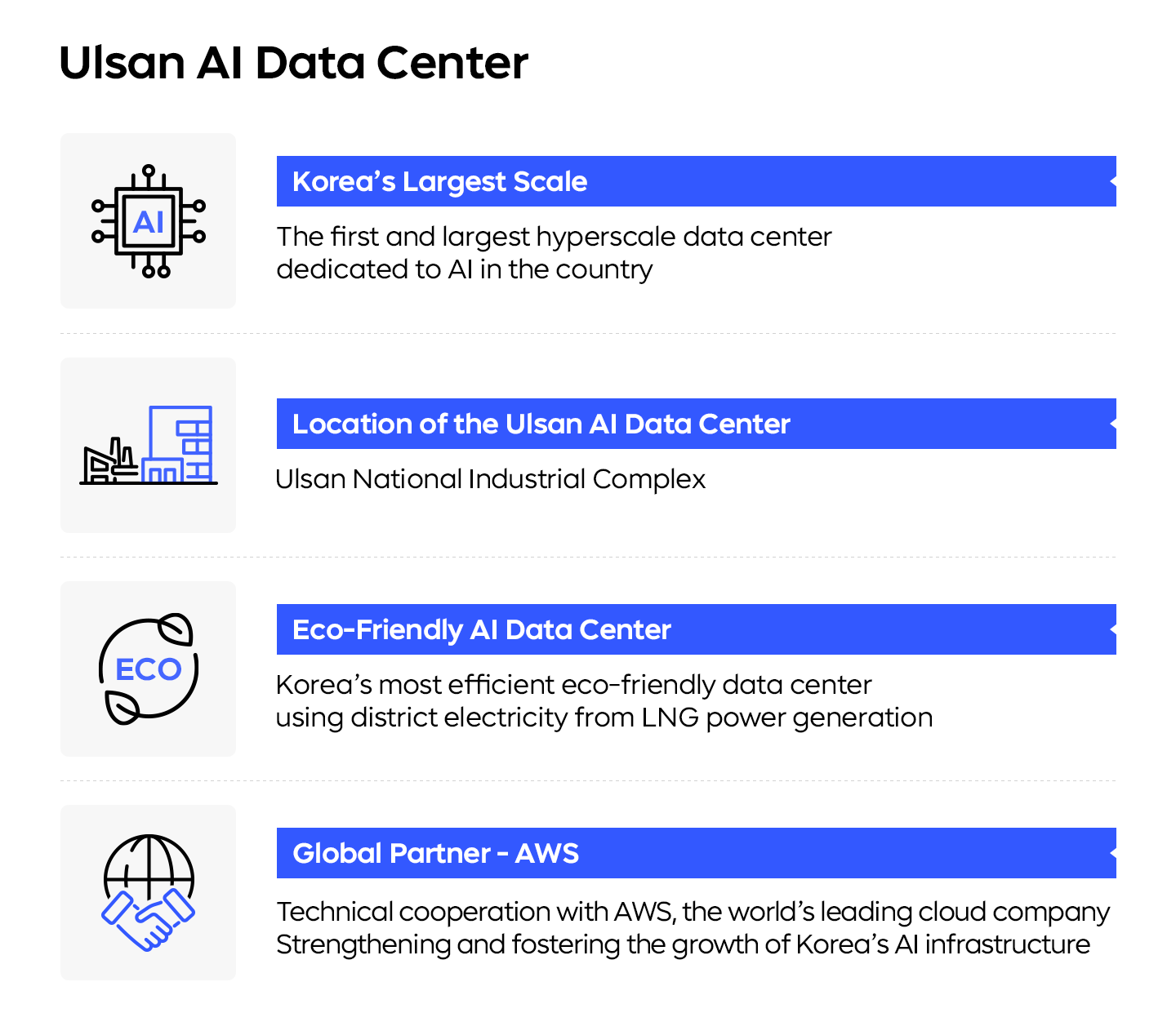 The Ulsan AI Data Center is a hyperscale facility, ranking among the largest scale in Korea. It is set to serve as a foundational infrastructure for Korea’s competitiveness as an AI hub in the Asia-Pacific region.
