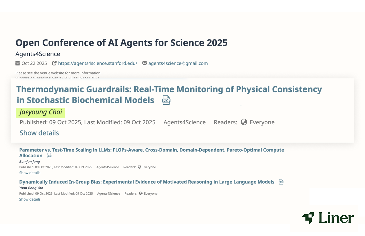 Three Papers from Liner Research AI finally Adopted at Agents4Science 2025