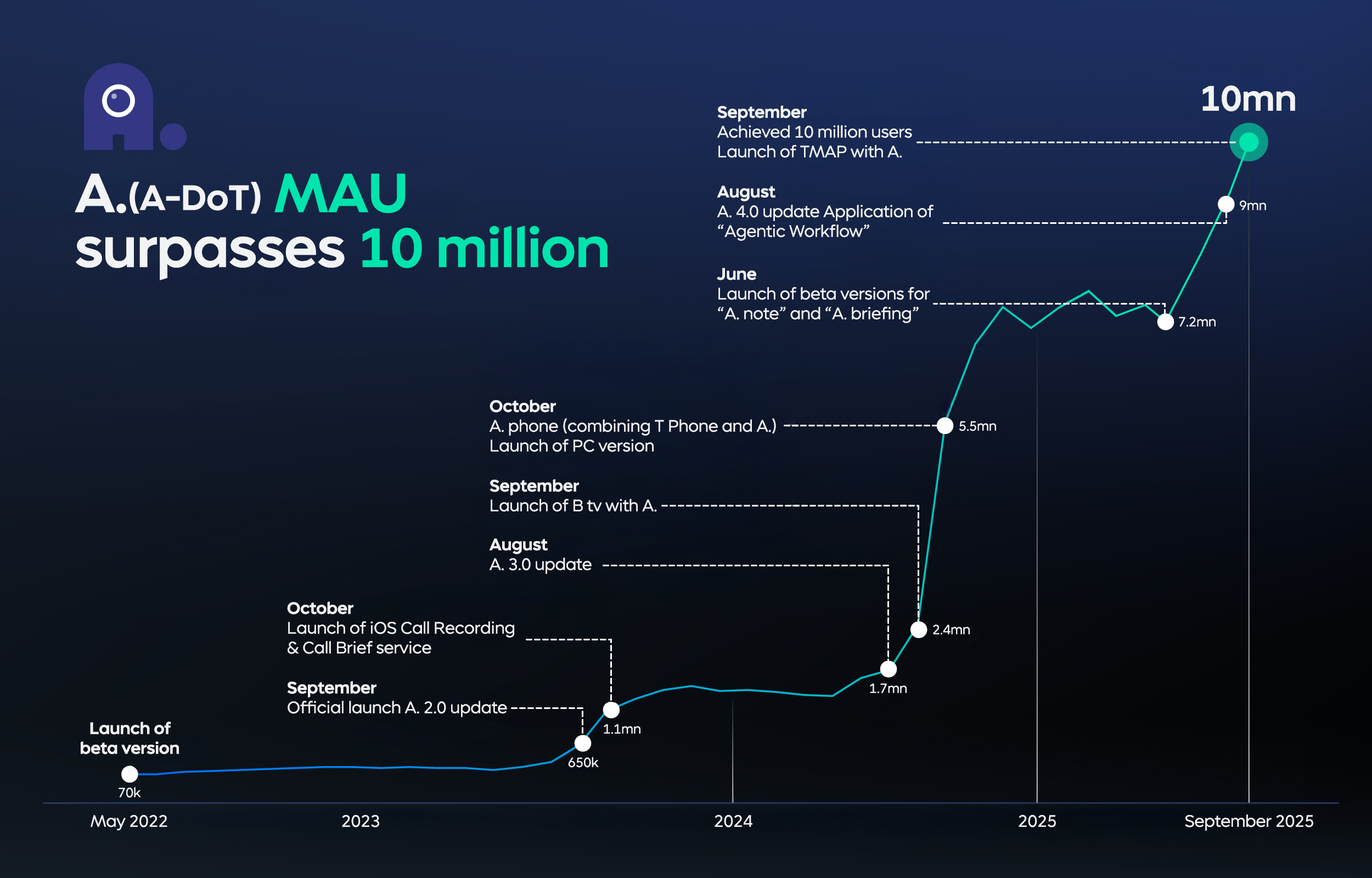 After launching the beta service in May 2022, A. has amassed 10 million Monthly Average Users (MAU), effectively leading the B2C AI market in Korea. Notably, the recently launched “A. note” successfully secured 300,000 users in a week, and the schedule and briefing (beta launch) functions can deeply understand situations and offer customized suggestions, proving the value of AI agents.